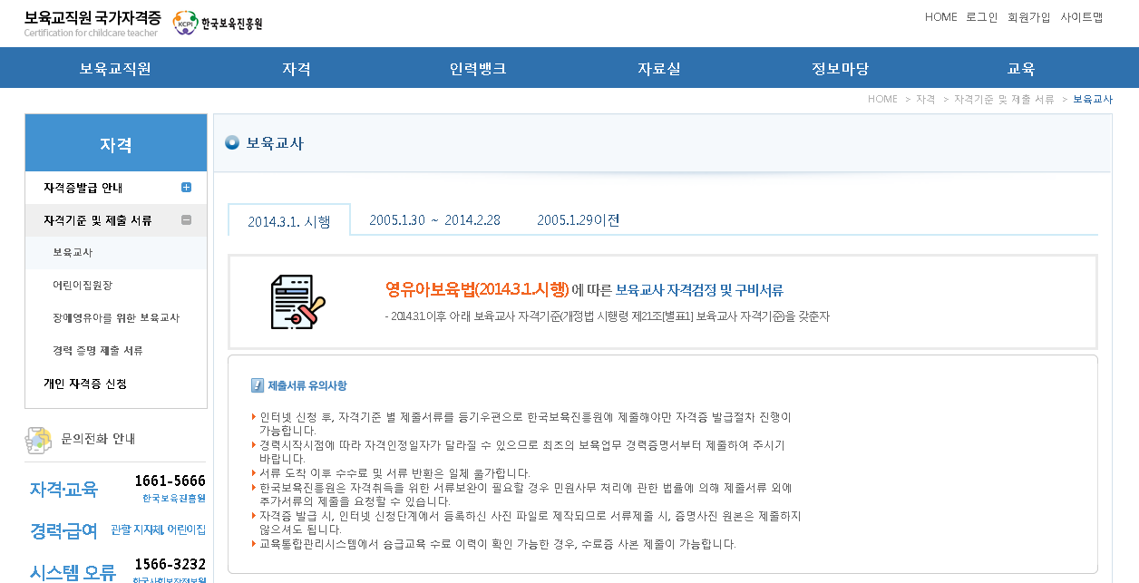 현재 영유아보육법의 시행에 따른 보육교사 자격검정 및 구비서류는 필수로 진행이 되어지고 있습니다. 때문에 보육교직원 국가자격증 홈페이지를 통하여 자격기준 및 제출서류를 확인하셔야 합니다.